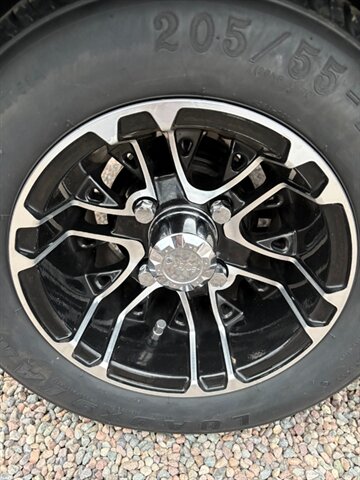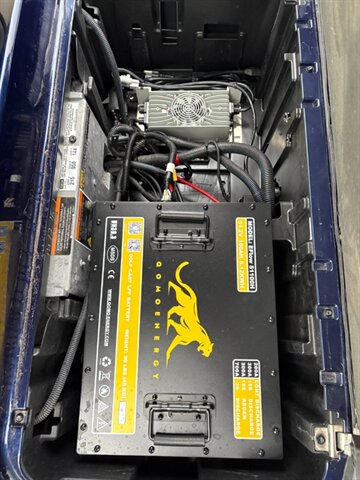 Golf Pkg., Custom Vinyl Seats, Lithium Battery, Snap on Enclosure, Custom Club Car Machine Black & Chrome Rims